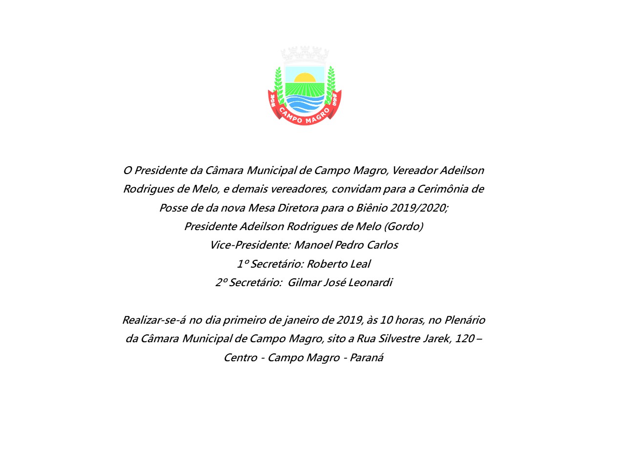 A Câmara Municipal de Campo Magro, tem a honra de convidar a população Campomagrense para Posse da Nova Mesa Diretora Biênio 2019/2020