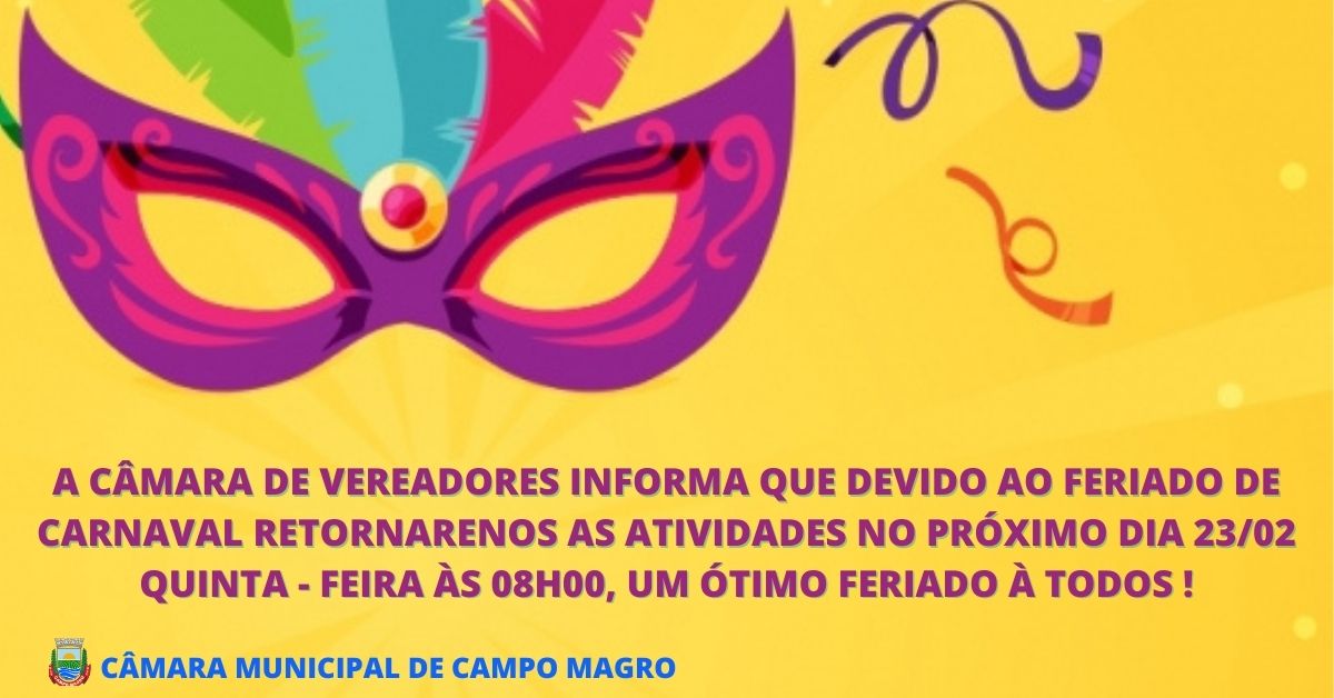 A CÂMARA DE VEREADORES INFORMA QUE DEVIDO AO FERIADO DE CARNAVAL, RETORNARENOS AS ATIVIDADES NO PRÓXIMO DIA 23/02